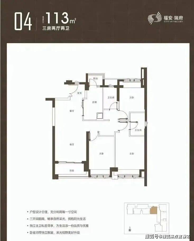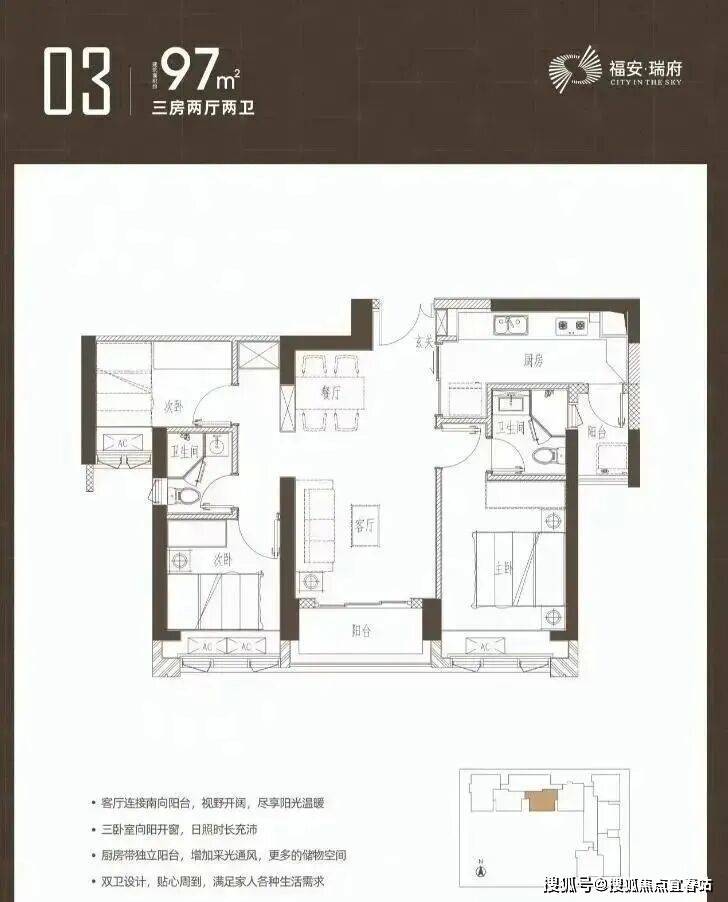 97-98㎡3房两卫户型为双龙抱珠格局;