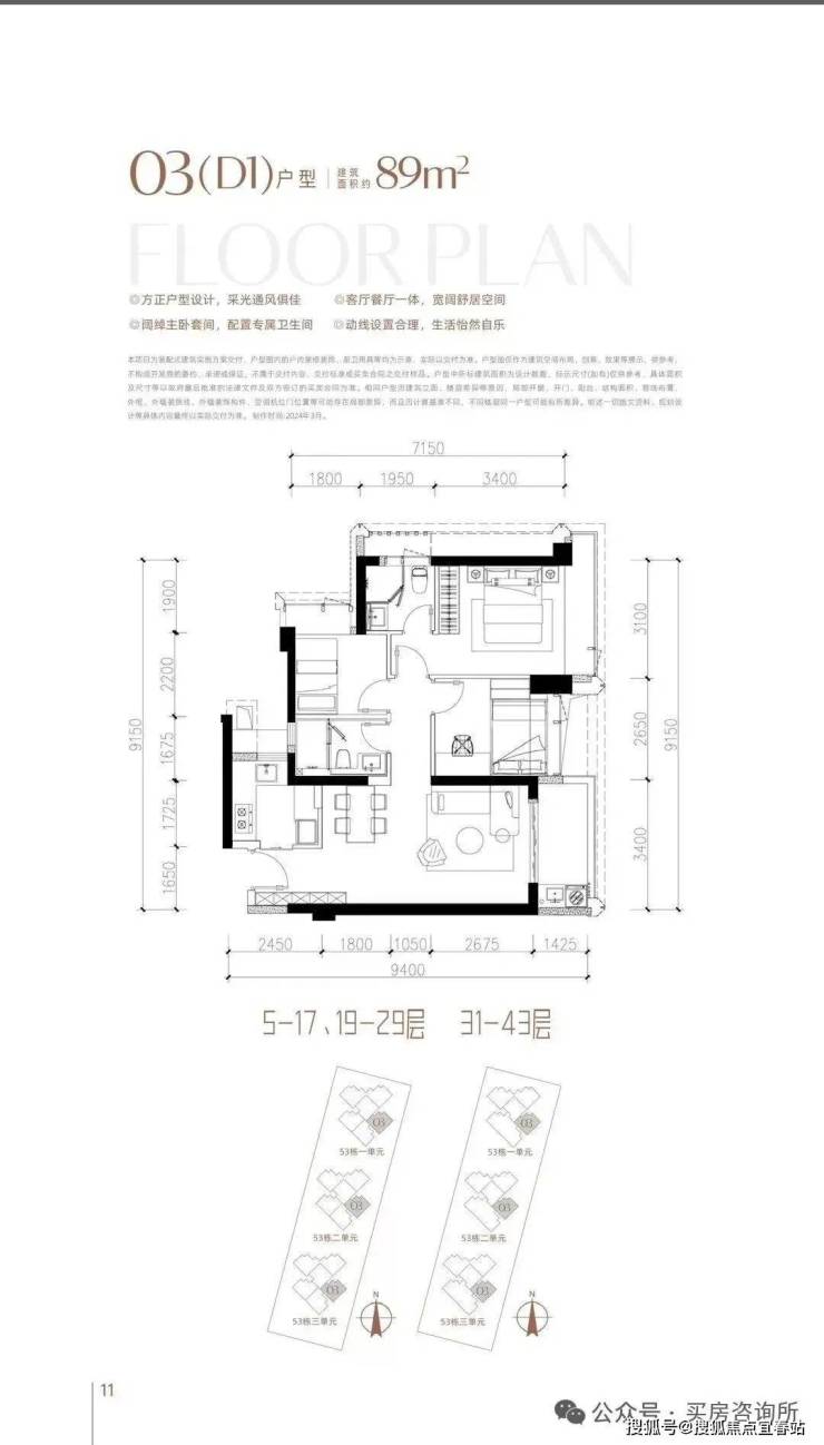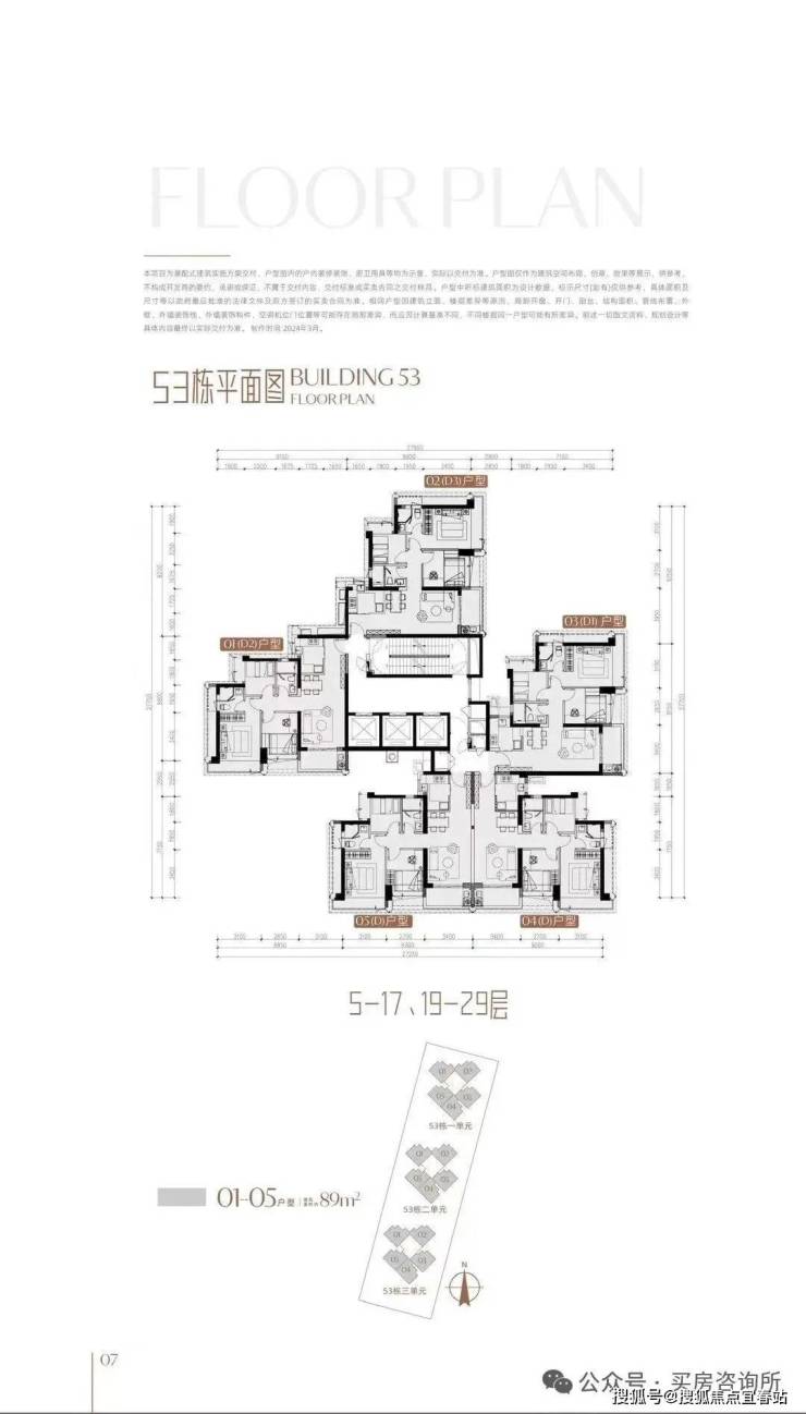 其中53栋3单元5-29层为三梯五户,都是89平三房。31-43层为三梯四户,其中3户为89平三房,1户为190平四房。这一栋也是小户型当中最好的一栋,89的01以及29楼以下得0405户型以及190㎡高楼层是可以看到海景的