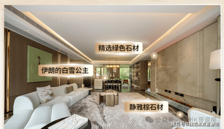 墙面到地面都由石材通铺,电视背景墙、厨房、岛台、窗台都为来自伊朗的白雪公主;