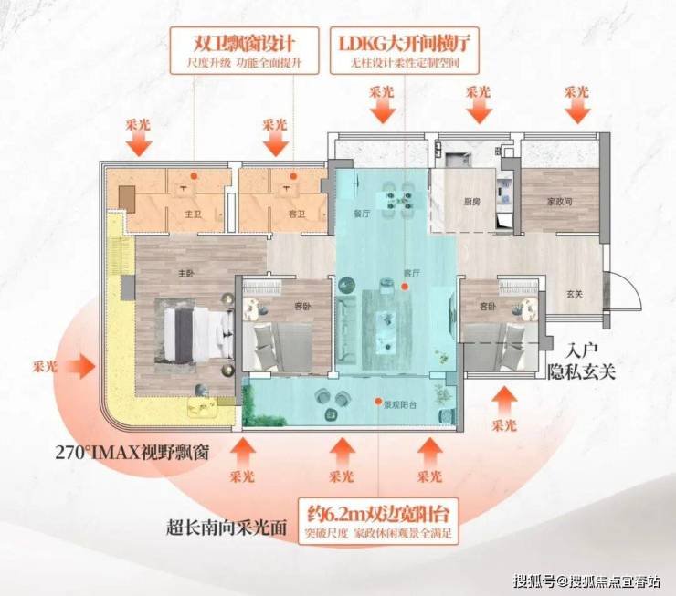 【93㎡四房两厅两卫】:南北通透,使用率约110%,五开间朝南,6.2米iMax级大阳台,独立入户玄关,南北通透,四面宽极致视野,主卧270°主卧弧形玻璃幕窗。