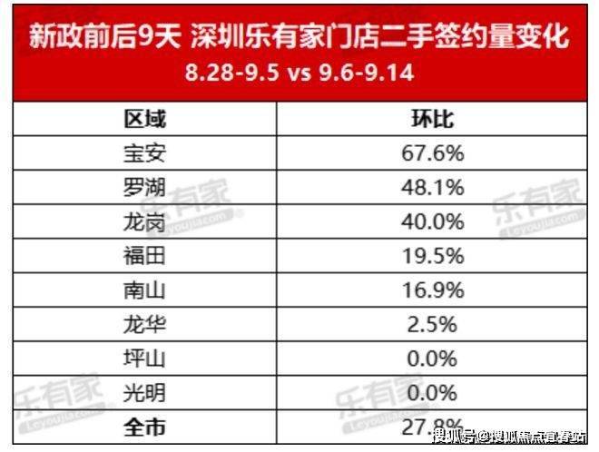 而中介机构则统计了深圳新政后9日的数据,即9月6日~9月14日,全市二手房签约量环比增长27.8%。其中,宝安、罗湖、龙岗的二手房签约量位居前列。