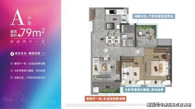约79㎡两房两厅一卫是整个项目面积最小的户型,是典型的竖厅设计。