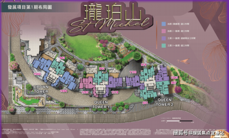 一期共3座住宅,包括第CROWN TOWER、QUEEN TOWER 1及QUEEN TOWER 2,户型实用面积920-2152平方呎,3-4房,户型图如下: