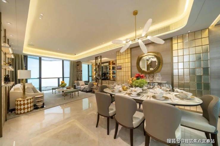 长形厅区空间宽敞,饭厅放置米白色云石纹图案餐桌,可供8人用餐,并挂上放射式吊灯,提升空间格调。客厅放上白色梳发,墙身设有特色浮凸图案,予人感觉高雅简朴,并外连41平方呎露台。