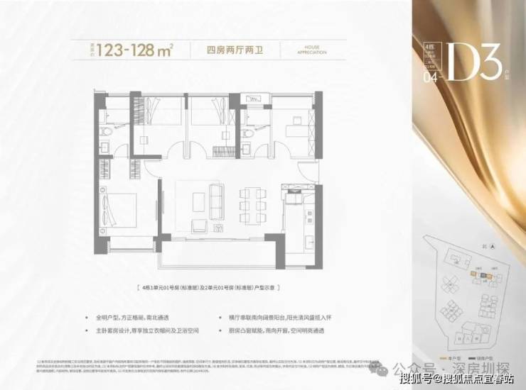 123-128㎡的4房2厅2卫,设计的是横厅南北通透格局,进门入户玄关,客餐厅6.6米开间,LDKB一体化设计,四开间朝南,主卧套房设计,6.6米超长观景阳台,U型厨房,卫生间干湿分离,得房率约72.45%(不含赠送),阳台主朝正南向。