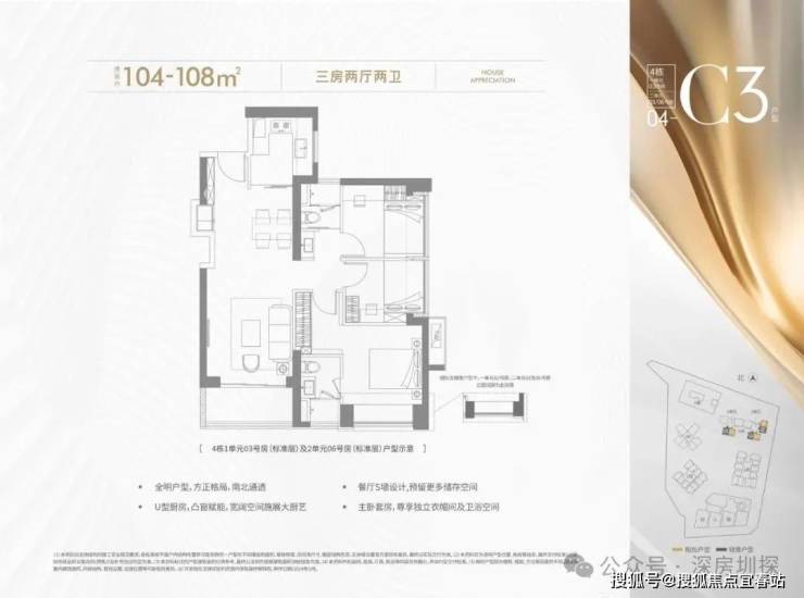 104-108㎡的4房2厅2卫,设计的是竖厅格局,进门入户玄关,客厅3.6米开间,LDKB一体化设计,进深8.7米,S墙设计预留冰箱卡槽位,三开间朝南,主卧套房设计,U型厨房,公卫三段式分离,得房率约72.45%(不含赠送),正南或正东朝向。