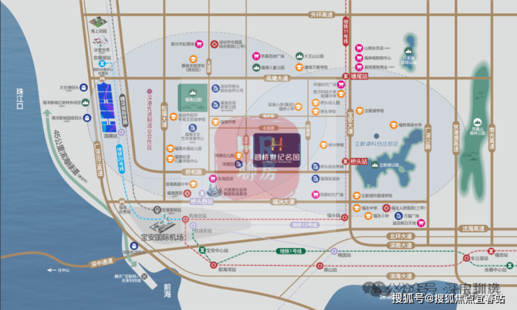 轨(地铁):距离地铁11号线桥头站步行约700米,12号线桥头西站步行约1300米。11号线作为西部主动脉,快速联通机场、宝中、前海、福田中心区。