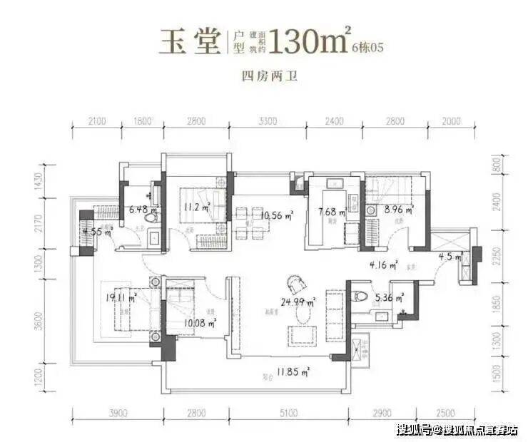 106㎡的4房2厅2卫,设计的是竖厅格局,客厅3.7米开间,LDKB一体化,S墙设计预留冰箱卡槽位,四开间朝南,动静分区,主卧270°无柱转角飘窗还带1个设备平台约1.52平,分别做到了主卧20.34㎡/次卧11.2㎡/次卧7.7㎡/次卧6.75㎡(包含墙体飘窗),U型厨房烟道外置,卫生间干湿分离,得房率约101.16%(包含赠送),客厅连接次卧出大阳台约11.76平,东南朝向。
