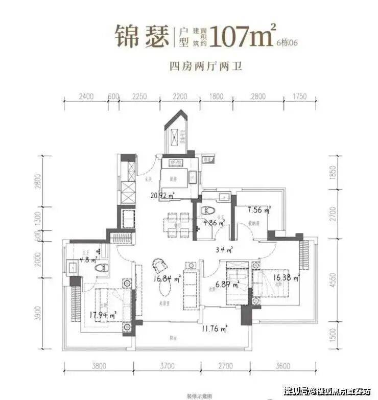 107㎡的4房2厅2卫,设计的是竖厅双龙抱珠格局,客厅3.7米开间,LDKB一体化设计,预留冰箱卡槽位,四开间朝南,主卧+2个次卧270°无柱转角飘窗,分别做到了主卧17.94㎡/次卧16.38㎡/次卧7.56㎡/次卧6.89㎡(包含墙体飘窗),U型厨房烟道外置,卫生间干湿分离,得房率约104.06%(包含赠送),客厅连接次卧出超大阳台约11.76平,东北朝向。