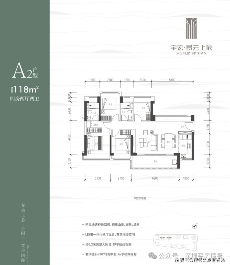 118㎡的4房2厅2卫,设计的是横厅南北通透格局,客餐厅6.2米开间,LDKB一体化,五开间朝南,西北面5.4米长的观景大飘窗,4个卧室分别做到了3.3米/2.7米/2.7米/2.3米的宽度,客厅连接餐厅位出6.2米长的大阳台,L型厨房,卫生间干湿分离,得房率约76%(不含赠送),东南朝向。
