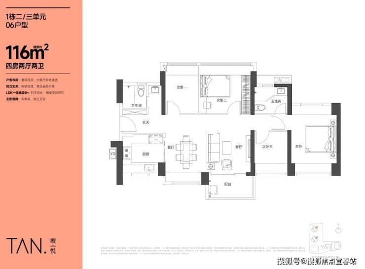 116㎡的4房2厅2卫,设计的是横厅南北通透格局,LKDB一体化设计,进门入户玄关,五开间朝南,超大宽面,主卧南北通设计,U型厨房,得房率:74.35%(不含赠送),阳台主朝东南向。