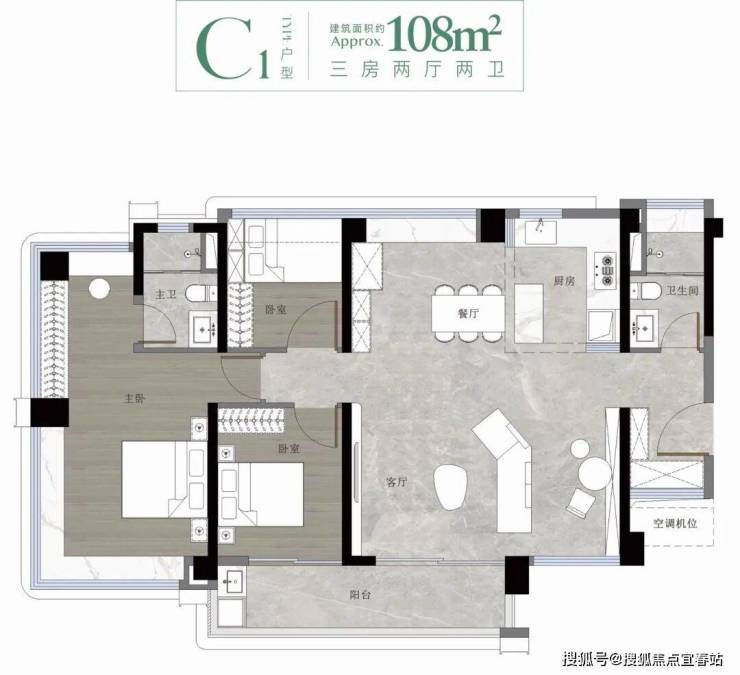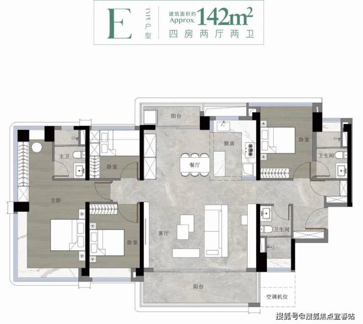 四、户型设计:南向全飘窗+高实用率 户型面积段79-142㎡三到四房,主打改善型产品,全部南向,带超大阳台,主卧标配270°或240°转角飘窗,采光与视野俱佳。项目最大亮点是高使用率,基本都达到100%以上,满足刚需到改善不同阶段家庭的需求。