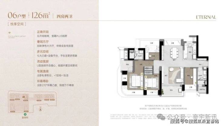 采用双龙抱珠格局,灵活适配成长型家庭。LDKB一体式布局,配备270°环幕主卧套房、U型厨房及七大飘窗,空间动静分离,实用且可变。
