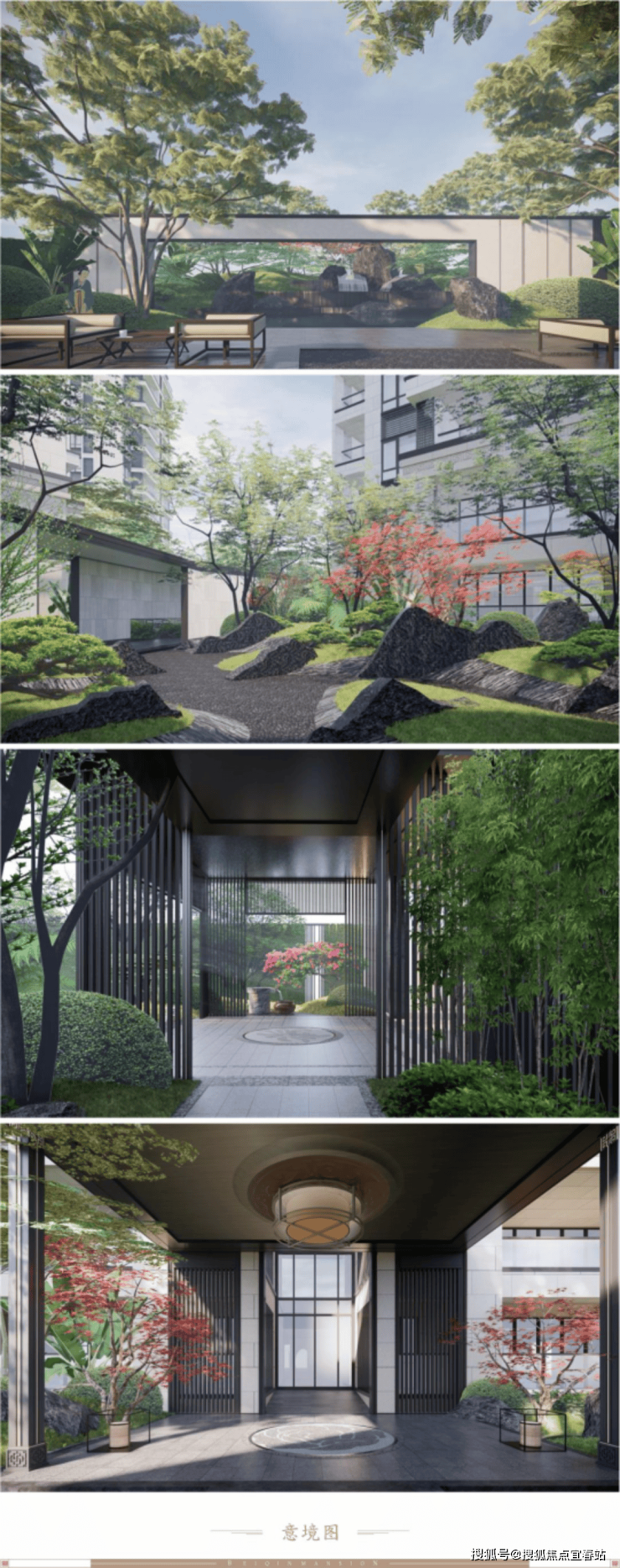 一进山水院,以叠石奇景,精巧花木为主,赋山形,观山语,呈现了一种如居山中的归家体验。二进镜水院,以水景、曲桥、角亭为主,呈现了符合中式生活特色的园林空间。