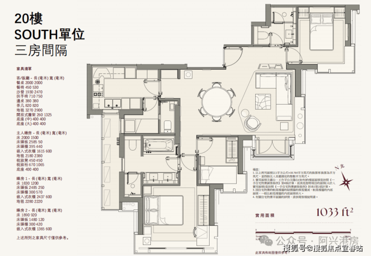 1楼 - 27楼 South 单位 三房: 1,033