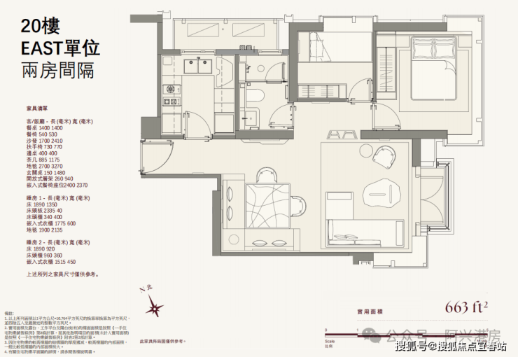 1楼 - 27楼 East 单位 两房: 663
