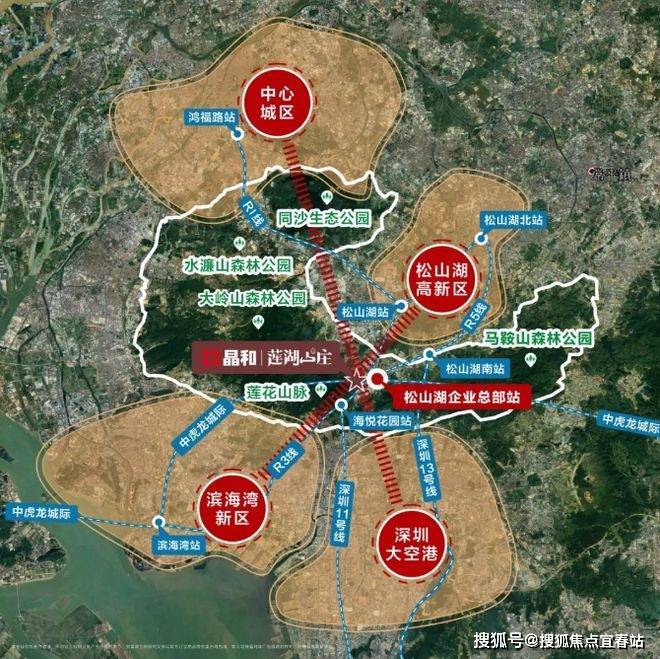 莲湖山庄坐落于三区核心交汇处,这三大区域分别为滨海湾新区、松山湖高新区以及深圳大空港。这一特殊地理位置,使得山庄恰好位于这三大城市发展要地的三角中心地带,且被莲花山脉环抱,其得天独厚的区位优势与完备的配套设施,绝非寻常项目所能比拟。