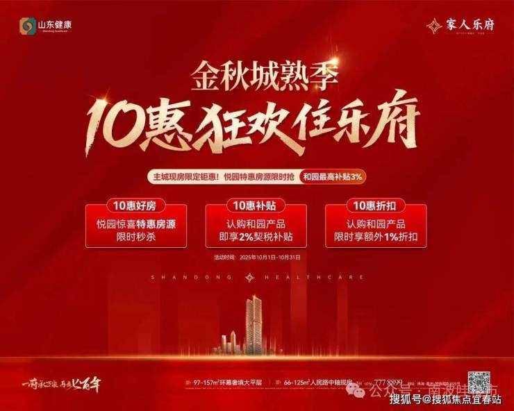 山东健康・家人乐府:项目推出“10 惠狂欢”活动,悦园建面约66-99㎡精奢现房限时秒杀,和园建面约77-125㎡现房及建面约97-157㎡大平层享额外1%折扣+2%契税补贴