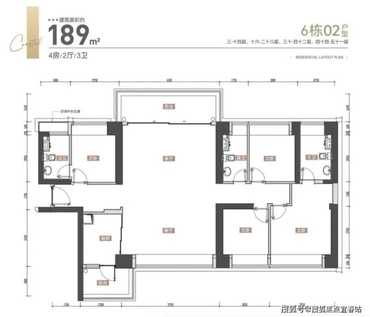 户型面积布局02189平四房两厅三卫户型除了双龙抱珠格局优势外还是南北通透的,客厅直连约6米宽、1.7米深的休闲大阳台,餐厅也设计有约4.6米宽的景观飘窗,与客厅的景观阳台呼应,使整个户型格局更加通透敞亮。户型亮点双套房三卫设计,让各个年龄层的洗漱习惯都有各自安放之处,居住的舒适度大大提高。