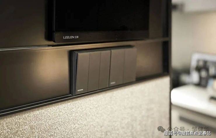 客厅整片的定制岩板背景墙及金属壁龛均为交标