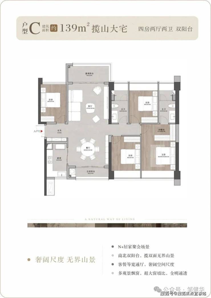 户型背山面海,超大的窗墙比将窗外无价的山海资源揽入户内,所有户型都可以看到开阔的山景,部分户型高楼层可以同时看到山海景观;南向大面宽、小进深,结合现代人家居理念的LDKB一体化设计,打造城市之芯的巨幕山海。