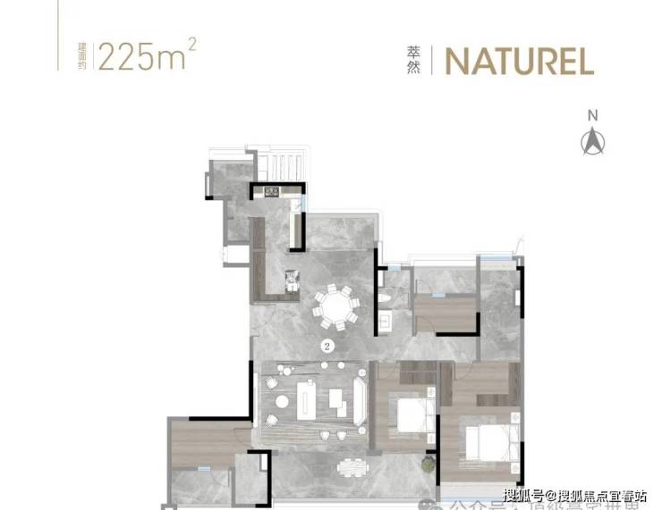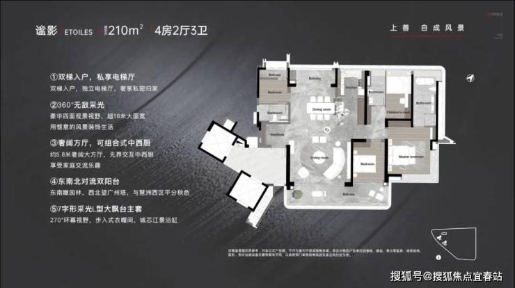 建面约210㎡户型,不仅做到三面采光,而且拥有超16米的南向面宽采光。南北双阳台,穿堂风得以直接灌入室内,尤其是270°南向巨幕阳台,更带来全面屏的自然美景。主套则采用了曲面转角飘窗设计,形成了约6.5米的全景转角大飘窗,在家里便可欣赏别人享受不到的窗景。而多套房、大衣帽间、大主卫设计,也契合了科技新贵“舒展”的生活方式。