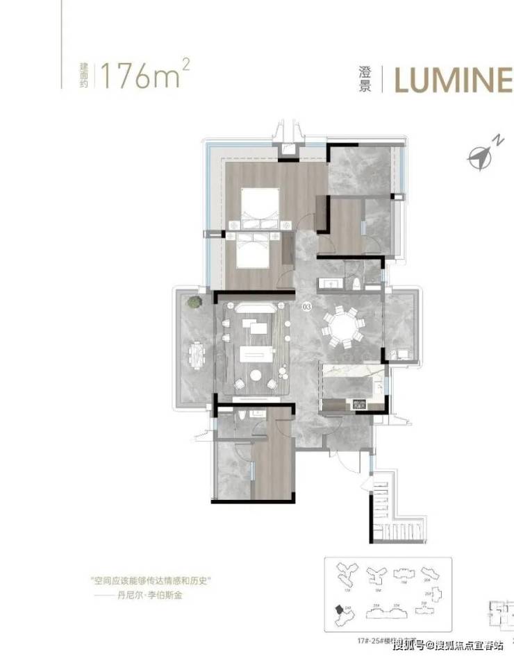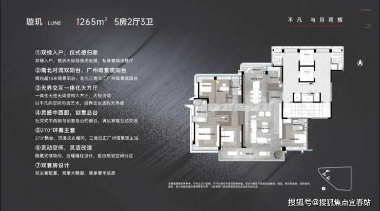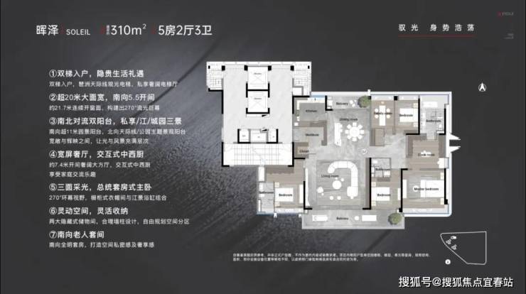 建面约310㎡户型,做出了超20米的南向大面宽,全面屏采光。约11.8米宽景阳台,成为天然的取景器,而每一个转身,也都能与明媚的阳光不期而遇。