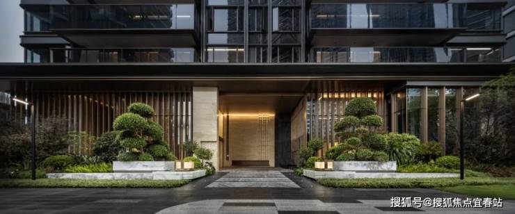 首先来看整体,石材与格栅的选材搭配,将高雅精奢的气质精准拿捏。建筑之外,两株造型冬青相互映照,就像礼宾迎接业主归来。