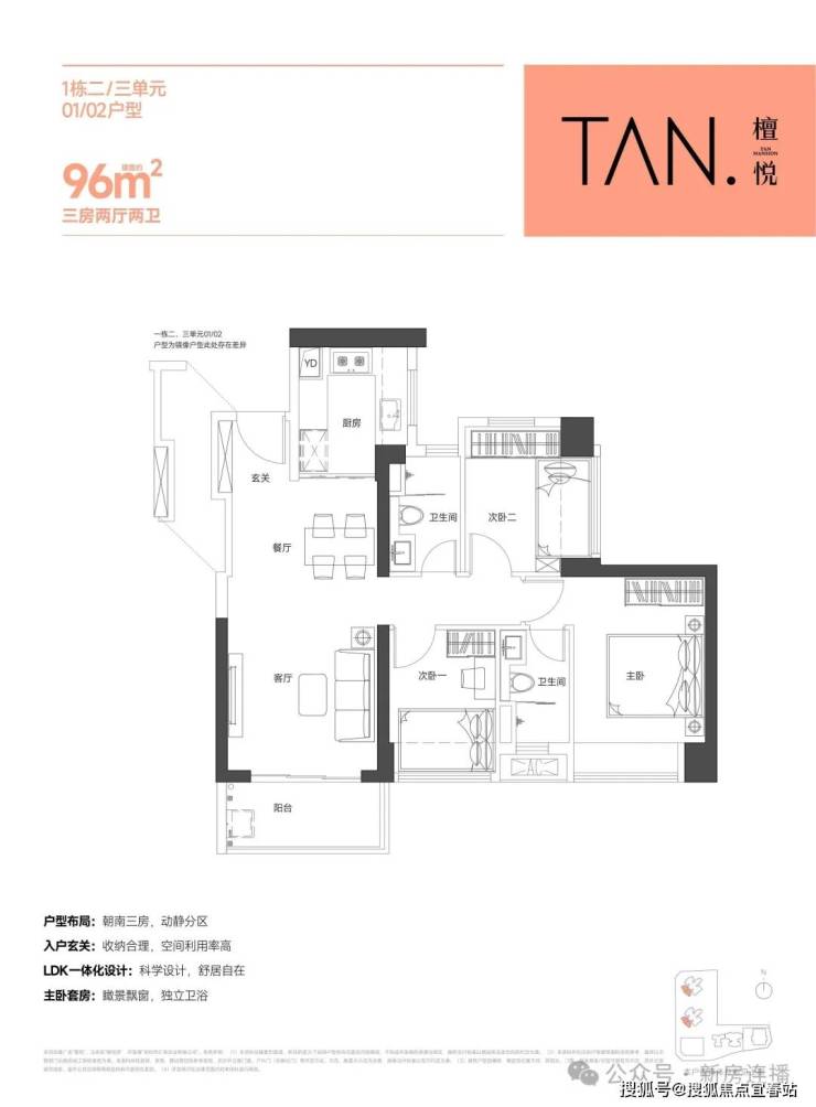 96平:3房2厅2卫,西南朝向,使用率74.34%(不包含赠送面积)