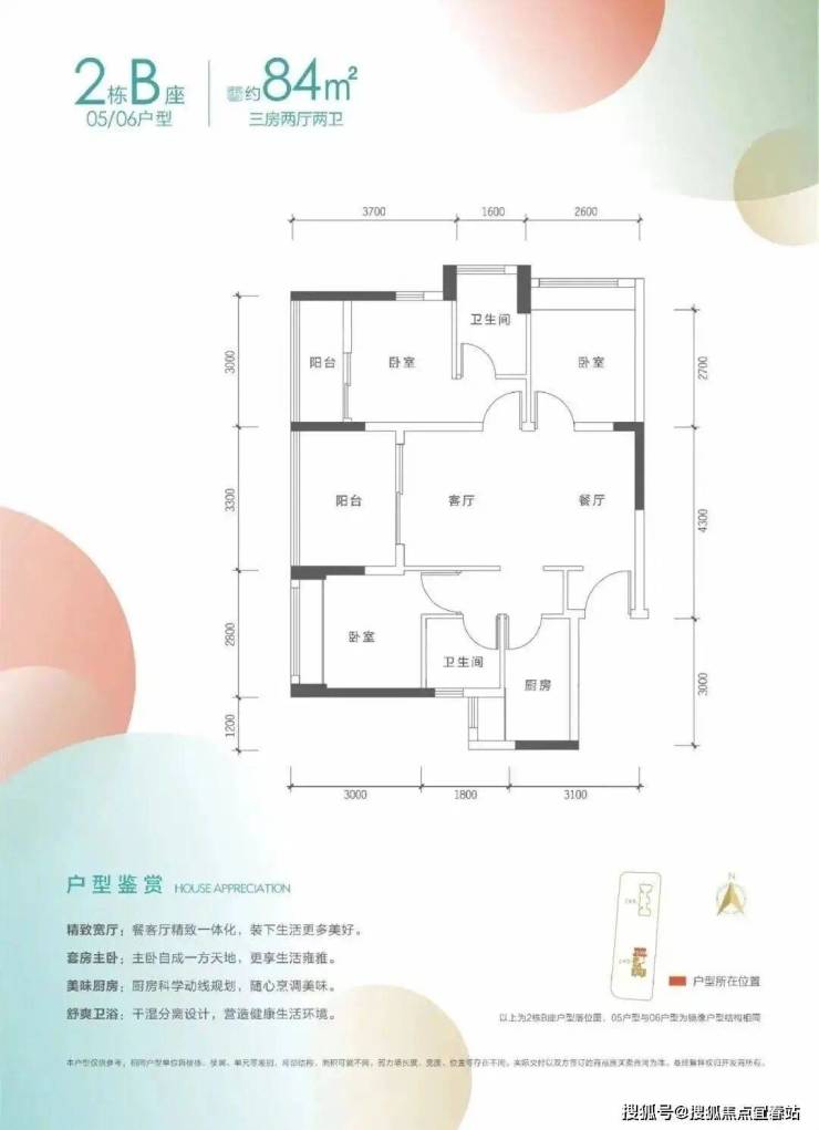 84㎡的3房2厅2卫,2栋B座05.06户型,设计的是经典竖厅格局,客厅3.3米开间,3个卧室分别做到了3米/2.8米/2.6米的宽度,客厅主卧双阳台设计,L型厨房,卫生间干湿分离,得房率:76.05%(不含赠送),阳台朝西向看楼岗公园或东向看旁边的前进公社小区。