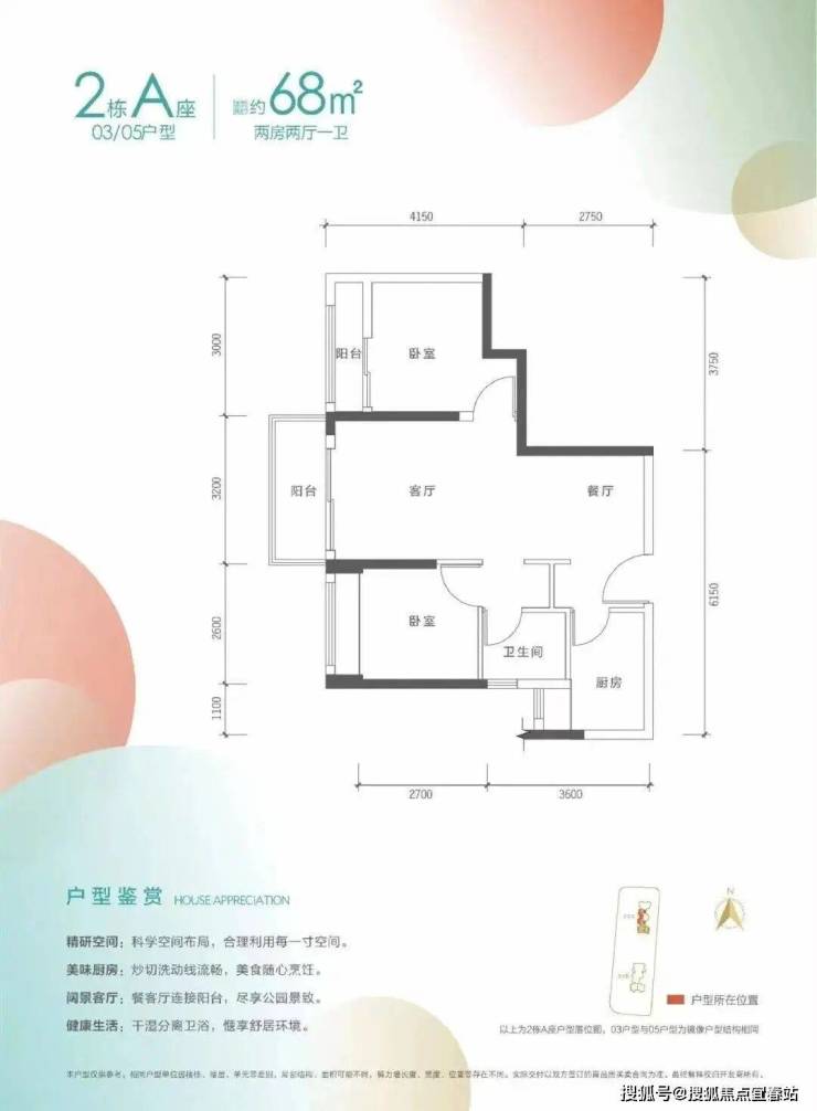 68㎡的2房2厅1卫,2栋A座03.05户型,设计的是竖厅双龙抱珠格局,客厅3.2米开间,2个卧室分别做到了3米/2.6米的宽度,客厅主卧双阳台设计,L型厨房,卫生间三段式分离,得房率:74.05%(不含赠送),阳台朝西向,看楼岗公园。