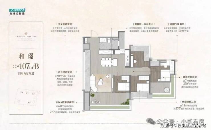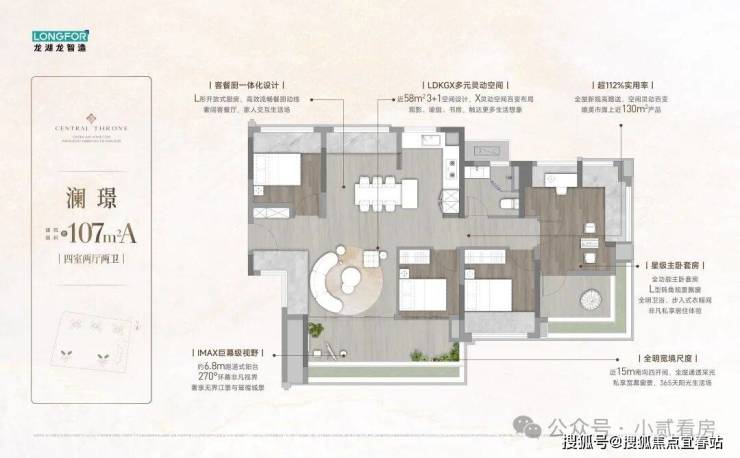 【107㎡】14.5米南向面宽+6.8米超大阳台对流+首创独立阳光女神衣厅+改善首选 约6.8米超大阳台,4.2米超大客厅开间,近38㎡LDK设计,首创独立阳光女神衣厅,新潮实用,约6.8米 270°环幕观景窗,舒居大四房改善必选!