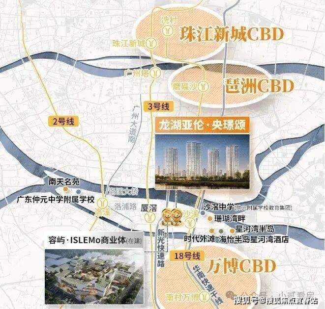 项目周边有双地铁,18号线+3号线可以直达珠江新城、琶洲等核心就业区,通勤便利。距离18号线沙溪地铁站约600-700米,18号线1站万博,2站琶洲,3站珠江新城。去3号线厦滘站有1公里左右,电鸡接驳比较方便。