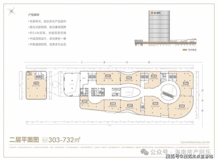 凤凰海岸单元——三亚中央商务区核芯片区,定位为旅游港自贸服务与邮轮、游艇、文化艺术综合消费区。紫金国际中心落位于此,匠造建面约6万㎡国际总部基地,实现区域城市服务、旅游文化、总部经济等产业资源全覆盖。