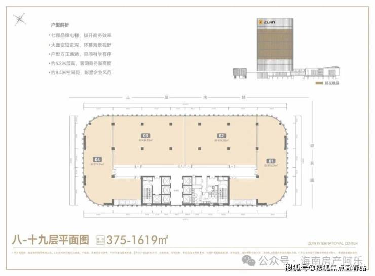 紫金国际中心将打造成三亚CBD大企业总部会客厅,由1幢瞰海办公主楼及裙楼创意空间组成,基于“见蓝见绿”的建筑原则,萃取”海浪造型“为设计理念,力筑风格更出彩、品质更高端、圈层更纯正的国际总部办公基地。
