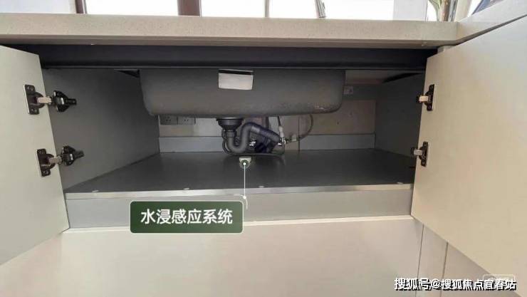厨房则安装了凉霸,清爽又舒服;厨房台面的隔水挡设置,防止水流和物品掉落;水槽下方柜底设置有铝箔,防腐防臭,容易清理;水槽下方预留有插座,方便以后安放垃圾处理器或小厨宝......
