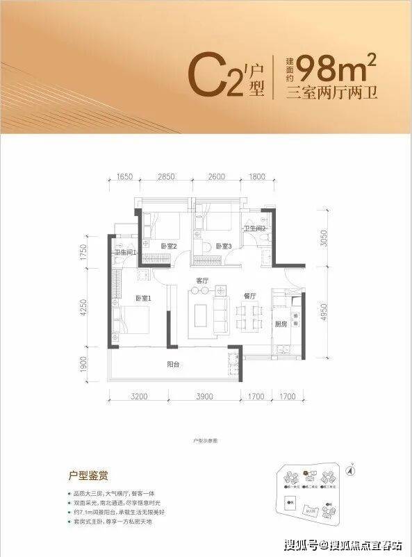 特点:LDKB一体化设计,主卧11.3㎡(含飘窗),次卧7.28㎡(含飘窗)x2。