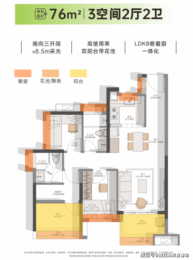 越秀是最懂刚需们心思的,面积该偷尽偷,把使用率打满。户型和功能,能怎么满足就都去满足,76方做三房两卫,深得刚需们的心。
