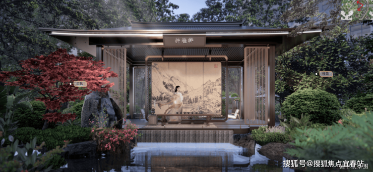 撷取清晖园“水榭、拱桥、奇石、飞瀑、花窗”五大元素,以现代设计语汇重塑岭南意象。