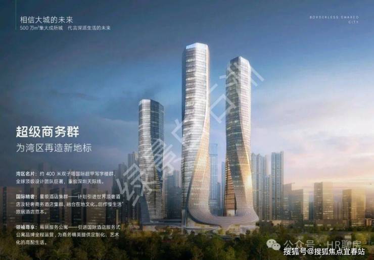 约400米双子塔国际超甲写字楼群,汇聚国际高奢酒店群(拟引进)、国际酒店服务式公寓,商务之旅一站即享。