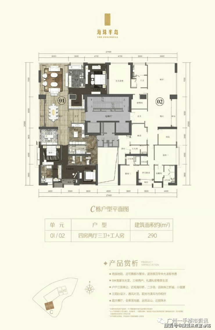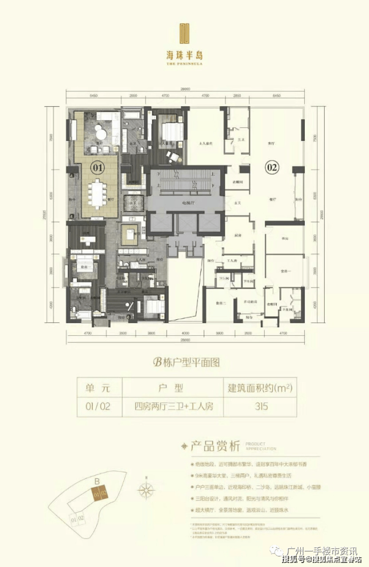 整个海珠半岛占地面积约6755㎡,建筑面积约63746㎡,小区整体规划为B、C两栋43层的超高层江景豪宅,住宅首层为10米挑高的大堂,2F为小区会所配套,3-43F为可售的住宅部分,户型涵盖290㎡和315㎡的大平层江景四房。
