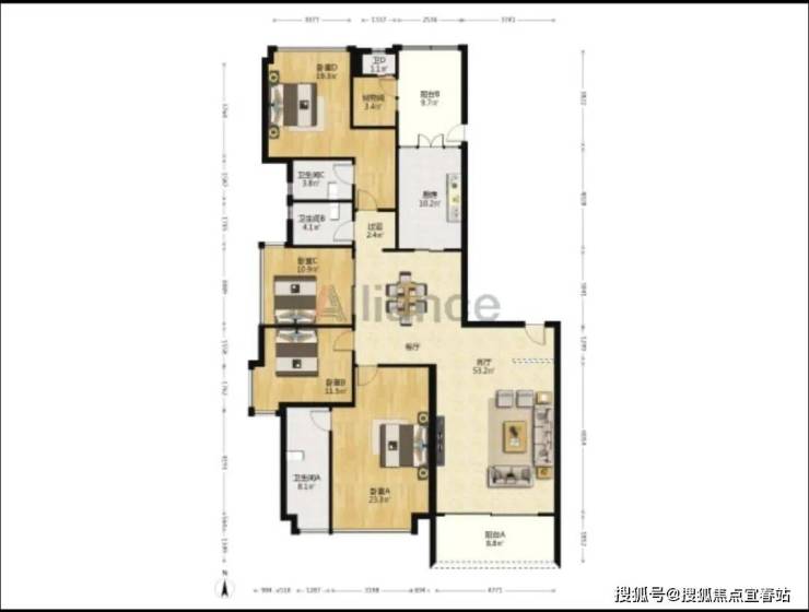 入门级是四房分别是A3栋02单位的211㎡、A4栋01单位的214㎡和A5栋01单位的214㎡(与A4栋01单位左右对称)。