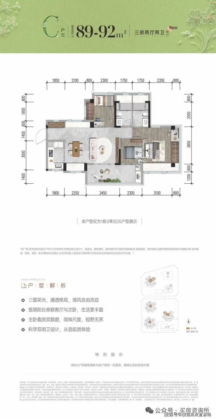 建面约92平3房的阔绰度更是惊人,约105%的得房率,阳台面积超10平,基本和市面主流170平的房子相当。