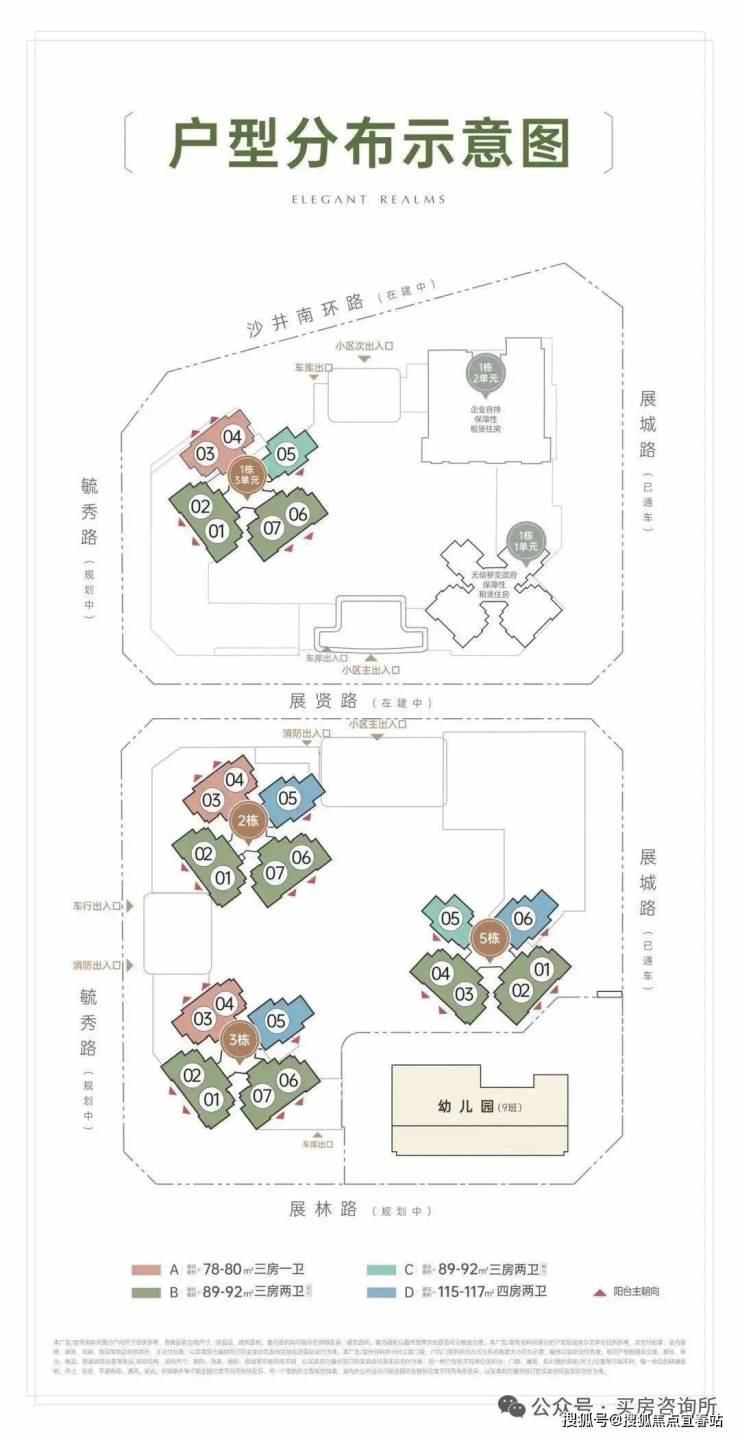 2、3、5栋为纯住宅,总高31-32层,4栋为1所4层2970㎡幼儿园,容积率4.3。