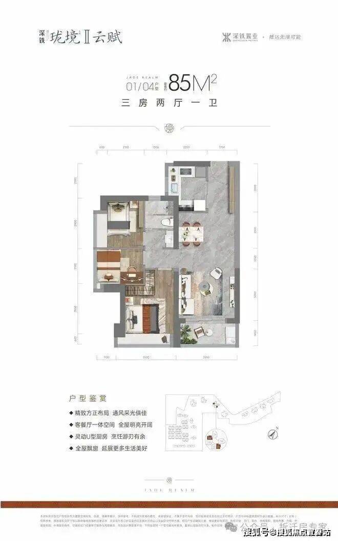 85㎡的3房2厅1卫,设计的是竖厅格局,进门入户玄关,客厅3.6米开间,LDKB一体化设计,动静分区,U型厨房,卫生间三段式分离,得房率约75.4%(不含赠送),西南或东南朝向。