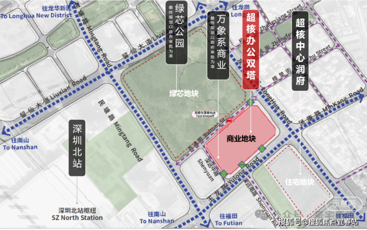 华润置地汲取以往片区统筹经验,结合龙华北站站城人TOD4.0的特点以超核绿芯的城市核及北站的枢纽核形成两核一轴格局,以超核带动片区全面升级,为深圳打造城市新名片。