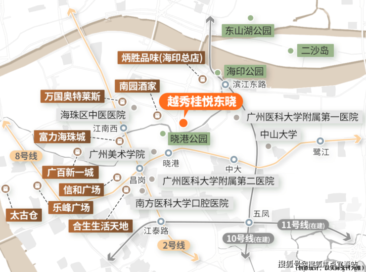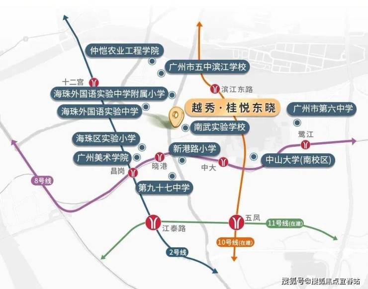 交通配套:距离地铁8号线晓港地铁站仅0.6km,可以直达琶洲、客村等商务圈,一站到昌岗可以换乘2号线,到南站、白云新城,三站客村换乘3号线,到珠江新城、体育西路,能实现40min内通勤。