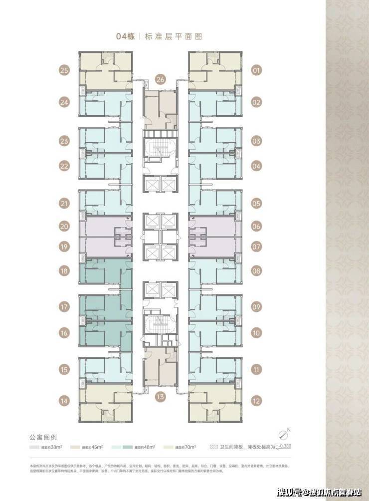 住宅由4栋48层建筑组成,分别是1栋、2栋1/2单元和3栋,3梯5/6户,4栋是商务公寓45F(1470户),5栋是幼儿园。