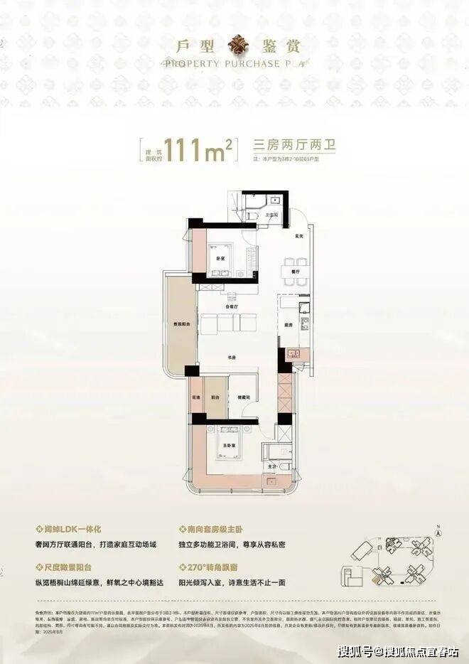 111㎡的3房2厅2卫,设计的是竖厅格局,LDK一体化设计,四开间朝南,主卧270°无柱转角全景舱,L型厨房,卫生间干湿分离,得房率约94%(包含赠送),西北朝向看一线梧桐山景观。