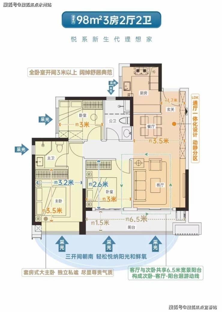 98㎡的3房2厅2卫:传统竖厅动静分区格局,客厅进深7.55米(不含阳台),开间3.5米,配有6.5米宽景阳台,主卧13.18㎡(不含主卫和飘窗),客厅空间变化不大,但厨房和卧室空间要好很多,居住的舒适性会比较好。